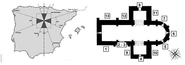 Utilizando la ermita como centro de una gran cruz templaria, en la que sus aspas se abrían 40º, y se separaban 50º entre sí, coincidía que los bordes de dicha cruz intersectaban con los enclaves templarios o esotéricos más relevantes de la península Ibérica, como Toledo, Caravaca, Culla, Palma de Mallorca, Fátima y Tomar entre otros.